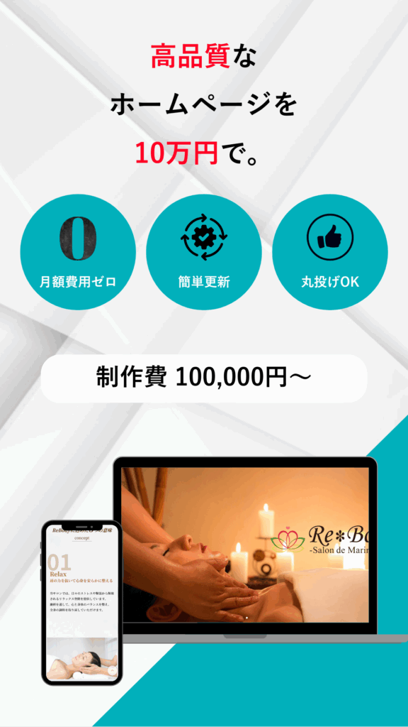 整体院やサロンの魅力を最大限に引き出し、お客様が思わず「頼みたい」と思われるホームページを作成します。サイトデザインを実現します。お客様でご自身で写真や文章をご用意していただいてもいいですし、文章が作れない場合は、丸投げしていただいてもOKです!